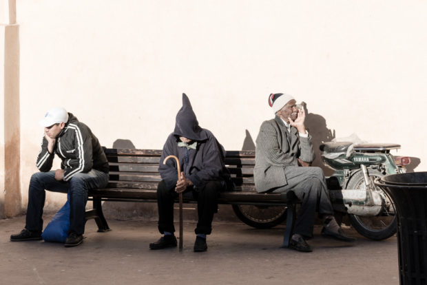 In der untergehenden Sonne findet sich ein Anblick, der jung und alt, Tradition und Moderne und wohl auch Kleidungsstil heute, gestern und damals vereint. Das sich die drei Männer dann auch noch gefühlt von einander abwenden, rundet den Kontrast ab.