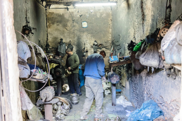In einer eher abgelegenen Seitengasse findet man Menschen, die diese Lampen mittels Poliermaschinen zum Glänzen bringen. Der deutsche Arbeitsschutz würde hier Amok laufen. Hände, Wände, Gesichter und Klamotten sind schwarz vom Metallstaub. Die Lungen sicherlich auch...