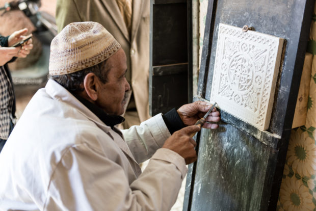 Während der Steinmetz (oder Stuckateur?) wohl noch so arbeitet wie seine Vorfahren vor Jahrhunderten laufen draußen nicht nur Touristen mit Handys durch die Gassen. Krasser kann der Unterschied zwischen Hektik und Gelassenheit, virtuell und analog, alt und neu kaum sein.