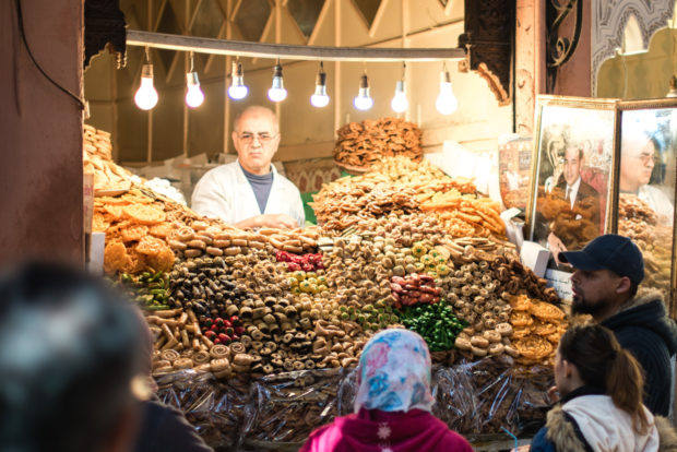 Man könnte ganze Webseiten mit der Darstellung der unterschiedlichsten kleinen Verkaufsstände und Geschäfte in der Altstadt von Marrakech füllen. Viele sind einfach nur Ramschläden, aber es gibt auch viele wirklich schöne und interessante unter ihnen. Dieser Stand hier ist einfach eine Trutzburg aus Süßigkeiten. Und süß heißt hier wirklich richtig süß. Die marrokanische Küche kennt hunderte von kleinen, feinen Leckereien und diese gibt es an jeder Ecke zu kaufen.