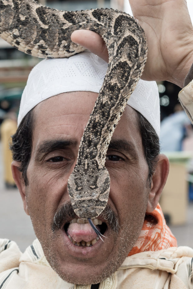 Als Schlangenfreund bleibe ich natürlich beim Anblick dieser Männer und ihrer Schlangen hängen - wenn auch recht wehmütig. Wissend, wie sich eine Kobra (die gleich vorne im Bild) üblicherweise verhalten würde und sehend, wie dieses Exemplar über eine Viertelstunde stumpf in der Drohhaltung verweilt, wird man erst zornig und später traurig, da man (wohl) auch akzeptieren muss, dass diese Menschen hier schlicht ihren Lebensunterhalt verdienen wollen. Und das ist in Marrakech eine andere Nummer als im schönen Europa.