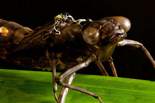 Die leere Hülle einer frisch geschlüpften Libellenlarve. Die Erschaffer von "Aliens" haben nur abgekupfert.