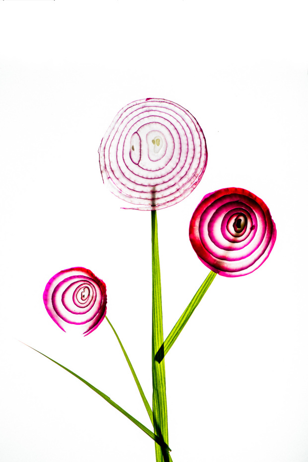 Mal was Unnatürliches mit Natürlichem. Gras und Zwiebelscheiben als Grundlage für ein Blumenbild. Ausbaufähig.