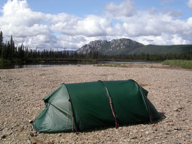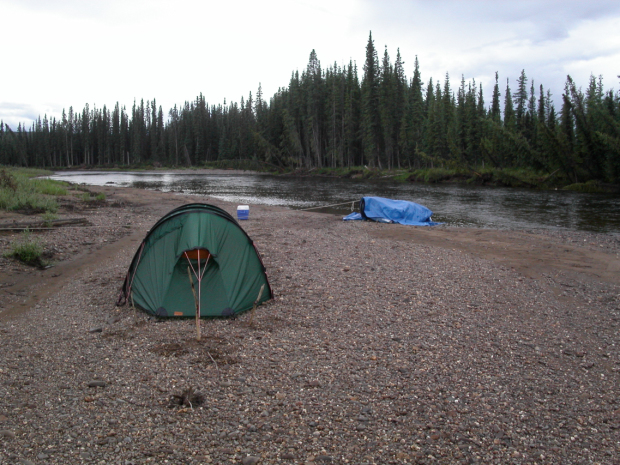 Nachdem die Unterbringung im Tarp verworfen wurde, musste das gute Hilleberg-Zelt (das habe ich tatsächlich über den Atlantik geschleppt) ran. Diese Bild zeigt sozusagen ein vorschriftsgemäßes Lager: Das Boot und die Ausrüstung mit einer Plane vor Regen geschützt und vor allem mit einem langen Tau sicher am Ufer vertäut. Die Box mit den Lebensmitteln, welche Bären anlocken könnte, im respektablen Abstand zum Zelt. Der alte Indianer-Trick, die Lebensmittel in einen Baum hochzuziehen, klappt in Alaska nicht. Die Bäume und deren Äste sind einfach zu mickrig. Abgerundet wird das Lager durch einen Stecken, den man bei der Anlandung an die Wasserkante setzt. So bekommt man mit, falls sich durch starke Regenfälle hinter einem der Wasserstand überraschend hebt und droht das Lager weg zu spülen.