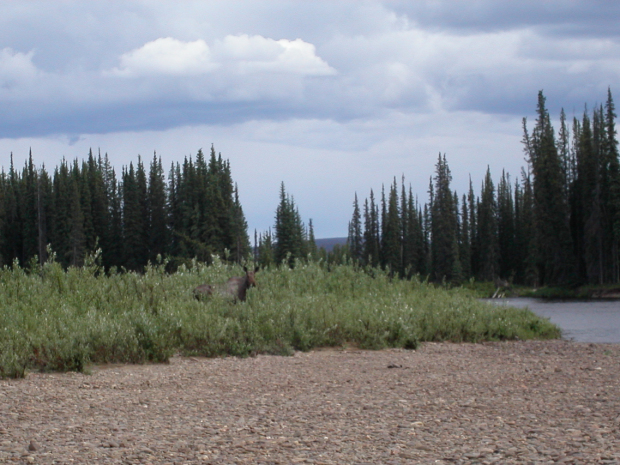 Diese Elchdame umschlug mein Lager am Vegetationsrand und warf immer mal wieder einen Blick auf den fremden Besucher. Dabei ließ sie sich auch vom Qualm des Kochfeuers, durch den sie seelenruhig durchschritt, nicht weiter beeindrucken.