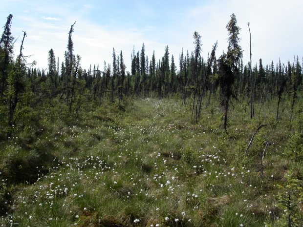 Wie auf dem Bild aufgrund des Wollgrases und des besonders lausigen Wuchses der Fichten zu erahnen ist, ist der Untergrund pitschnass. Solange man von Dolde zu Dolde balanciert, ist alles gut. Rutscht man ab, steckt man fast bis zum Knie im Morast.
