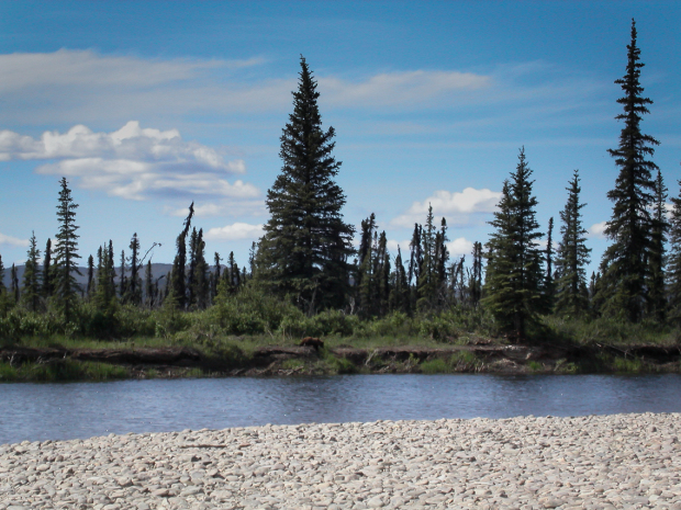 Dieser kleine Vertreter blieb schön artig auf der anderen Flussseite und ich konnte mein Bären-Spray und die Waffe wieder wegstecken und stattdessen fotografieren. Der Puls war trotzdem "leicht erhöht".