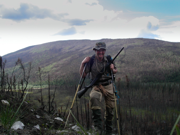 Selbst mit leichtem Gepäck war man noch ganz schön beladen. Neben der Waffe, dem Bären-Spray (an der blauen Schnur) war stets der Notfall-Rucksack am Mann. In diesem war ein klassisches Survival-Kit, Erste-Hilfe-Material, Wasserbeutel, Wasserfilter (das Wasser in Alaska ist mit Bieber-Fieber verseucht) GPS und Satelliten-Telefon.