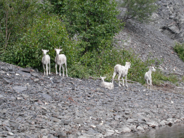 Dieses Dall-Schaf mit Jungtier lief etwa 10 Minuten am Fluss entlang. Sie suchten eine geeignete Stelle zur Querung, das Jungtier schön im Strömungsschatten des Muttertieres. Da ich wusste, dass diese Tiere normalerweise in größeren Herden leben, folgte ich ihnen.