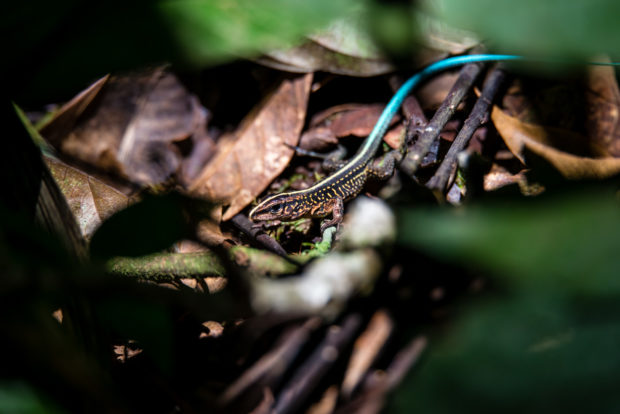 Eigentlich könnten diese Eidechsen recht unauffällig und vor allem unentdeckt von Feinden ihr Leben recht beschaulich gestalten. Wer allerdings im Dschungel mit solch auffallend gefärbtem Schwanz durch die Gegend flitzt, wird selbst von Touris entdeckt.