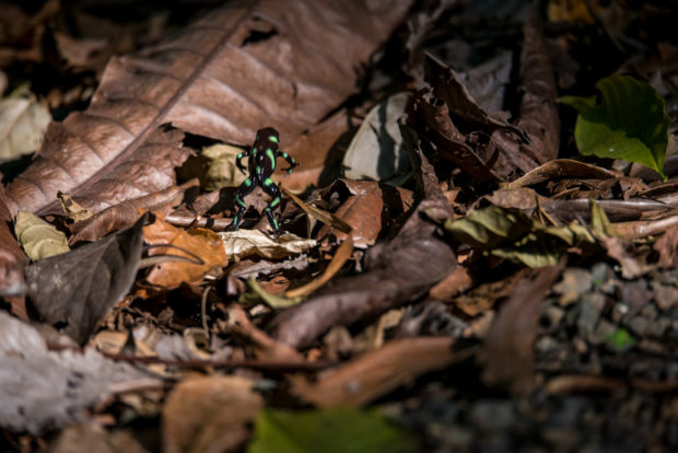 Dieser kleine Hüpfer ist ein Färberfrosch (gehört zu den Pfeilgiftfröschen), welchen wir sozusagen auf den letzten Drücker nach intensiver Suche endlich entdeckt hatten.