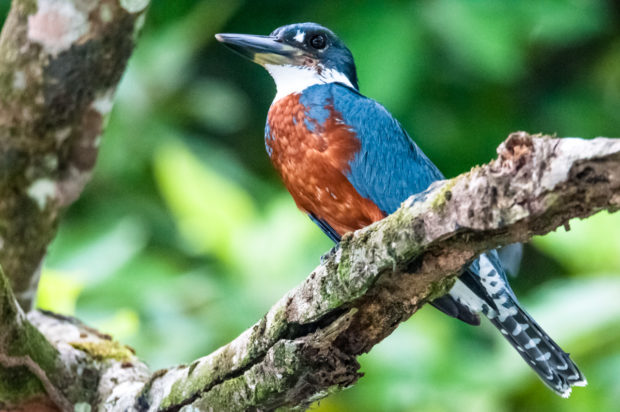 Der blaue Fischreiher betrachtet unser vorbei gleitendes Boot argwöhnisch. Wir haben Tirimbina verlassen und sind nun an der Karibikküste bei Moin angelangt und haben uns ein kleines Boot samt Guide gechartert, um auf einem Fluss den Küsten-Dschungel zu erkunden.