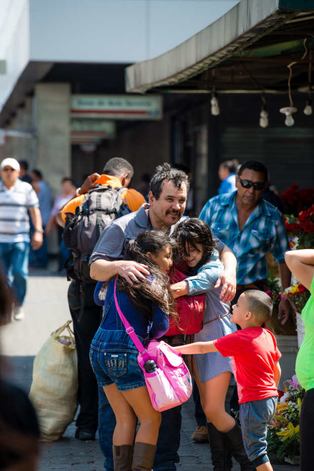 Ich kann nur erahnen, wieso der Vater lange weg war - klar ist aber, dass seine Kinder sich überschwänglich freuen, ihren Vater wieder in die Arme schließen zu können. Eine kleine glückliche Szene inmitten des hektischen Treibens der Großstadt.