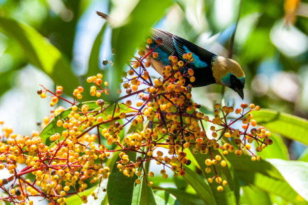 Auch hier wimmelt es von Vögeln. Dieser hier ist im Flug deutlich imposanter (man achte auf die auffallenden langen Schwanzfedern) als auf einem Ast hockend. Er lässt sich von unserer Anwesenheit aber nicht im geringsten von seinem Speiseplan abbringen und futtert weiter entspannt die Samen dieses Baumes.