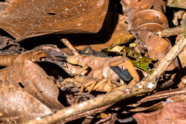 Selbst jetzt, da sich der Skorpion im Breitformat in der Bildmitte befindet, muss man schon zweimal hinschauen, um die Zangen und den stachelbewehrten Schwanz zu entdecken.