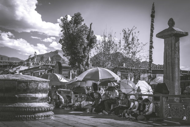 Der Jokhang-Tempel ist das zentrale Heiligtum des tibetischen Buddhismus. Die Pilger haben Tempel auf drei Rundwegen, den Koras zu umrunden. Einer geht um die gesamte Altstadt, einer um das Viertel und einer unmittelbar um den Tempel. Erst dann darf der Tempel betreten werden. Vorher hält der Pilger Einkehr - hier auf dem Bild unter Schirmen vor der Sonne geschützt zu sehen.