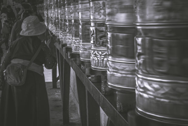 Rund um jeden Tempel finden sich überall in Tibet zahlreiche Reihen mit Gebetsmühlen. Über ein unter den Mühlen angebrachtes Holzkreuz kann der Gläubige die Mühlen in Rotation versetzen. Jede Umdrehung ersetzt für den Gläubigen das sprechen von Gebeten bzw. erhöht deren Anzahl. Viel hilft viel.
