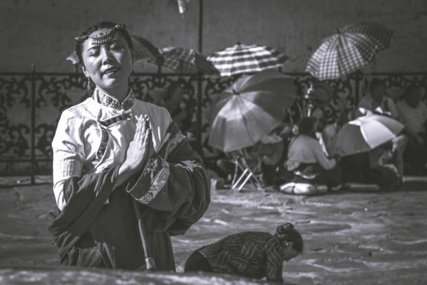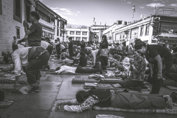 Der gläubige Tibeter wirft sich zum Zeichen seines tiefen Glaubens mehrfach vor dem Tempel auf den Boden. Der Steinboden ist von tausenden Gläubigen über die Jahrhunderte blank geschliffen worden.