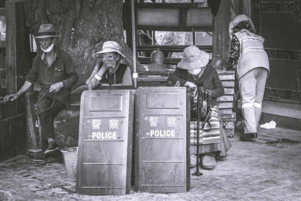 Ganz Tibet wird akribisch von chinesischer Polizei überwacht. Der Zugang in die Altstadt Lhasa erfolgt durch Metalldetektoren und Gepäckkontrollen wie am Flughafen. In der Altstadt ist in jeder Straße, jeder Kreuzung und jedem wichtigen Gebäude Polizei omnipräsent. Die Dienstpflicht lässt allerdings manchmal zu wünschen übrig. Eigentlich sollten unter diesem Sonnenschirm zwei Polizisten auf Posten stehen, haben sich aber in einem nahegelegenen Geschäft anderweitig beschäftigt. So blieben nur die beiden alten Damen hinter den Schutzschilden zurück, was nicht einer gewissen Komik entbehrt.