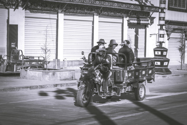 Ein solches Dreirad stellt in den Städten Tibets das häufigste Transportmittel für Material dar. Das hier der Herr drei werte Damen transportiert, ist eher die Ausnahme. Für den Transport von Personen ist der Roller mit Abstand das häufigste Gefährt in Tibet. Interessant ist, dass es in ganz Lhasa ausschließlich (!) Elektro-Roller gibt, was den Lärmpegel deutlich reduziert. Keine Ahnung wo die Dinger geladen werden - öffentliche Ladesäulen gab es definitiv nicht - aber auch definitiv keinen Verbrennungsmotor bei Rollern. Wenn Lhasa das schafft, sollten wir es irgendwie auch auf die Kette bekommen...