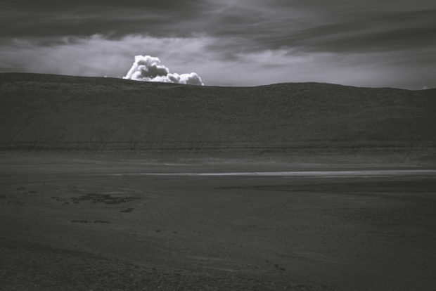 Wenn man selber so hoch ist, dass die Wolken auf Augenhöhe sind, kommt es zu solchen Anblicken. Hinter der Ebene eines fast ausgetrockneten Salzsees erhebt sich ein Hügelkamm, der die dahinterliegende Wolke schlicht aussperrt. Eventueller Regen fällt auf der anderen Seite des Kamms und der Salzsee bleibt trocken bzw. wird immer salziger.
