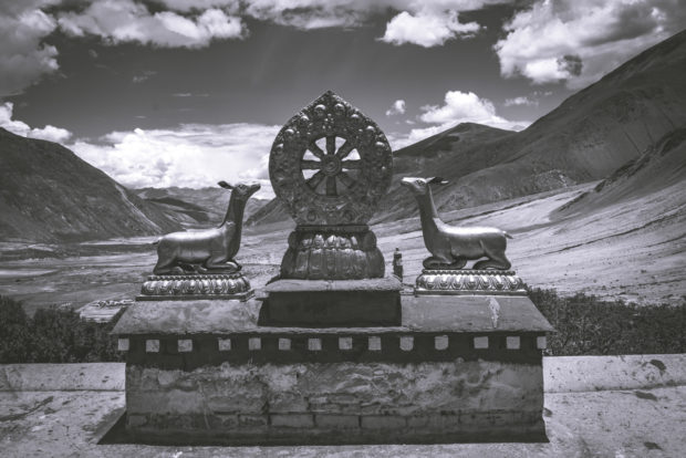 Dieses Bild ist bezeichnend für Tibet. Über einer atemberaubenden Landschaft thront das Rad des Glaubens, das Dharma-Rad als Zeichen des tibetischen Buddhismus´. Mit allen Konsequenzen. Da das Rad ein heiliges Symbol ist, gab es in Tibet keine Karren o.ä. mit Rädern - alles wurde anderweitig transportiert, auch wenn es ein Vielfaches mühseliger war.