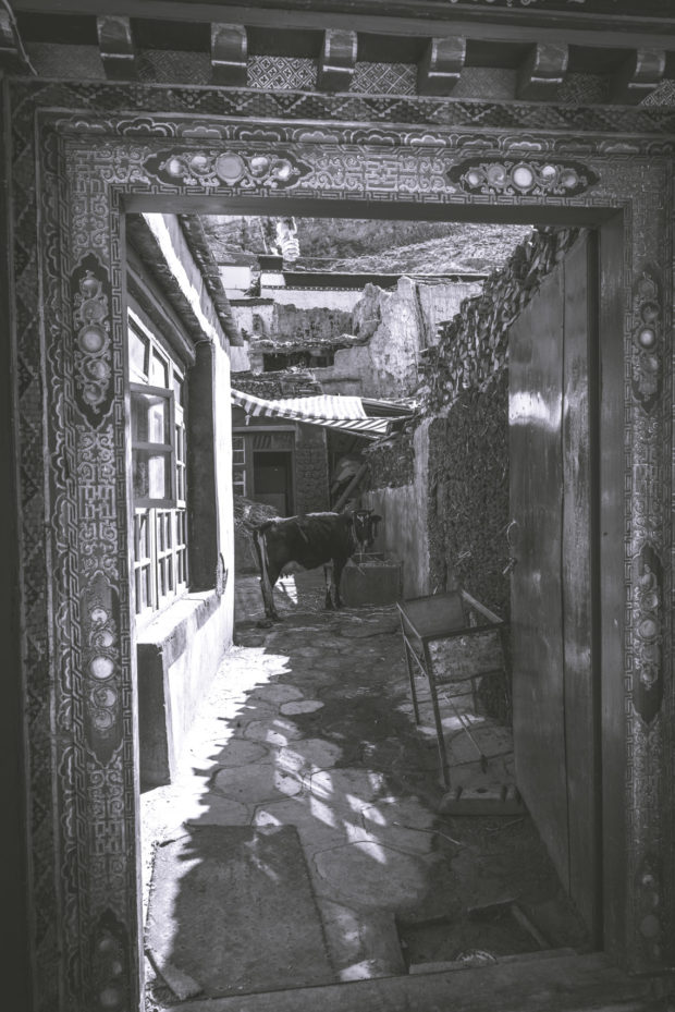 Hinter der prächtig verzierten Eingangstür zu einem tibetischen Haus findet sich wie so oft in Entwicklungsländern der Wettstreit zwischen Moderne und Vergangenheit. Da hängt zwar schon eine moderne Energiesparlampe vom Giebel, aber an der Wand klebt der Kuhdung, der dort zum Trocknen angebracht ist. Brennmaterial ist so weit oberhalb der Baumgrenze kostbar und Holz wird für den Bau der Häuser benötigt - zum Verbrennen viel zu schade. Die Kuh wirkt mitten im Hof ein wenig deplatziert, macht aber einen durchaus zufriedenen Eindruck.
