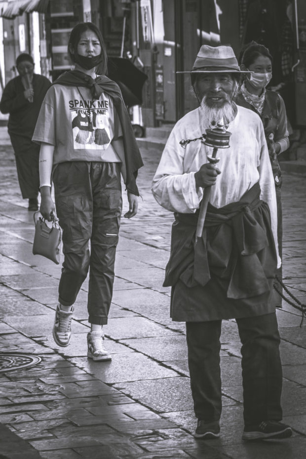 Für den gläubigen Tibeter ist es Pflicht einmal im Leben den Jokhang-Tempel besucht und umrundet zu haben. Egal wie alt man ist. Gerade bei den älteren Pilgern ist die Gebetsmühle und die Gebetskette obligatorisch. Allen gemein ist eine Gelassenheit und Freundlichkeit.