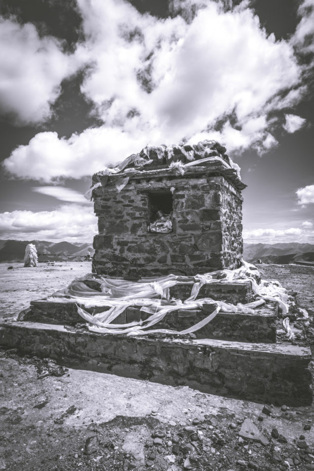 Dieser Platz hatte es mir angetan. Der Anblick der Gebetsfahnen über dem Opferschrein in Verbindung mit dem Fluss, den Hügeln und dem Schattenspiel der Wolken auf deren Hängen hat mich gefesselt. Mit jeder Minute wandelte sich der Anblick aber immer war das Gefühl von Weite und Freiheit zugegen.